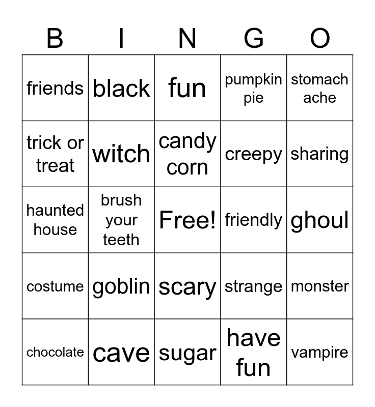 This bingo card has a free space and 37 words: pumpkin, skeleton, black cat, witch, monster, goblin, candy corn, broom, stomach ache, cavities, brush your teeth, pumpkin pie, vampire, ghoul, trick or treat, costume, thank you, fun, scary, friendly, friends, sharing, chocolate, sugar, be safe, have fun, black, orange, Ninja, Unicorn, bats, cave, haunted house, full moon, strange, creepy and three eyes.