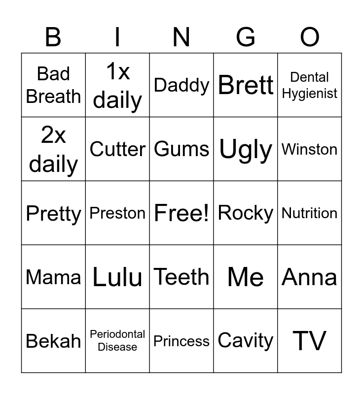 This bingo card has a free space and 26 words: Teeth, Cavity, Gums, Periodontal Disease, Dental Hygienist, Bad Breath, 2x daily, 1x daily, Nutrition, Me, Ugly, Pretty, Anna, Bekah, Preston, Pace, Brett, Mama, Daddy, TV, Winston, Princess, Rocky, Lulu, Cutter and Pumpkins.