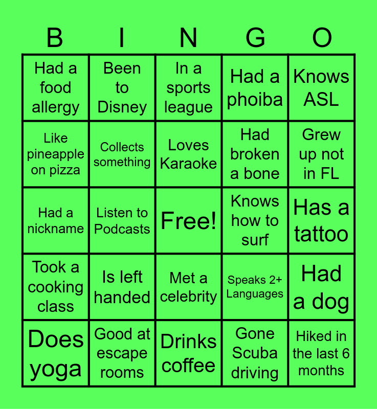 This bingo card has a free space and 24 words: Is left handed, Good at escape rooms, Loves Karaoke, Does yoga, Knows ASL, Had a food allergy, Like pineapple on pizza, Been to Disney, Knows how to surf, Met a celebrity, Had broken a bone, Had a nickname, Speaks 2+ Languages, Had a dog, Collects something, Gone Scuba driving, Has a tattoo, In a sports league, Grew up not in FL, Listen to Podcasts, Hiked in the last 6 months, Took a cooking class, Had a phoiba and Drinks coffee.