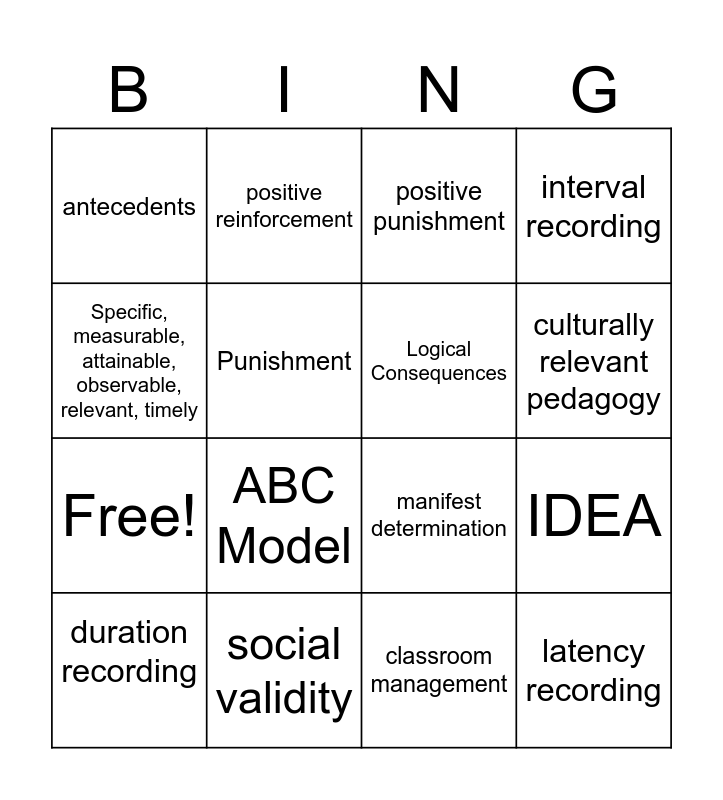 This bingo card has 20 words: IDEA, negative reinforcement, positive punishment, Positive Behavioral Interventions and Supports, duration recording, Specific, measurable, attainable, observable, relevant, timely, social validity, antecedents, Free!, positive reinforcement, ABC Model, manifest determination, Punishment, latency recording, Logical Consequences, Praise, Misbehavior, Procedures, Routines, Rules, culturally relevant pedagogy, interval recording, classroom management and Interactive modeling.