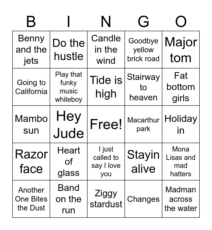 This bingo card has a free space and 29 words: Another One Bites the Dust, Killer Queen, Hey Jude, Maggie Mae, Benny and the jets, Candle in the wind, Play that funky music whiteboy, Heart of glass, Macarthur park, Band on the run, Holiday in, Madman across the water, Ziggy stardust, Changes, Fat bottom girls, Misty mountain hop, I just called to say I love you, Razor face, Major tom, Mambo sun, Stayin alive, More than a woman, Stairway to heaven, Going to California, Goodbye yellow brick road, Do the hustle, Mona Lisas and mad hatters, Tide is high and Lucky man.