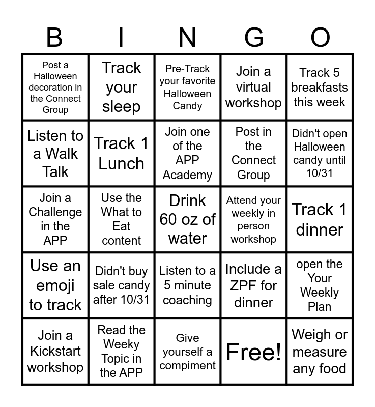 This bingo card has 30 words: Read the Weeky Topic in the APP, Set a Goal for the week, Use the What to Eat content, Track your weight 1X this week, Post a Halloween decoration in the Connect Group, Pre-Track your favorite Halloween Candy, Track 1 Lunch, Listen to a 5 minute coaching, Attend your weekly in person workshop, Give yourself a compiment, Track 1 dinner, Drink 60 oz of water, Free!, Weigh or measure any food, Didn't open Halloween candy until 10/31, Bought andy for trick or treaters, Include a ZPF for dinner, Use an emoji to track, Didn't buy sale candy after 10/31, Track 5 breakfasts this week, Join a Challenge in the APP, Track an activity, Track your sleep, Post in the Connect Group, Listen to a Walk Talk, Join a virtual workshop, open the Your Weekly Plan, Join a Kickstart workshop, Join one of the APP Academy and Introduce yourself in the Connect group.