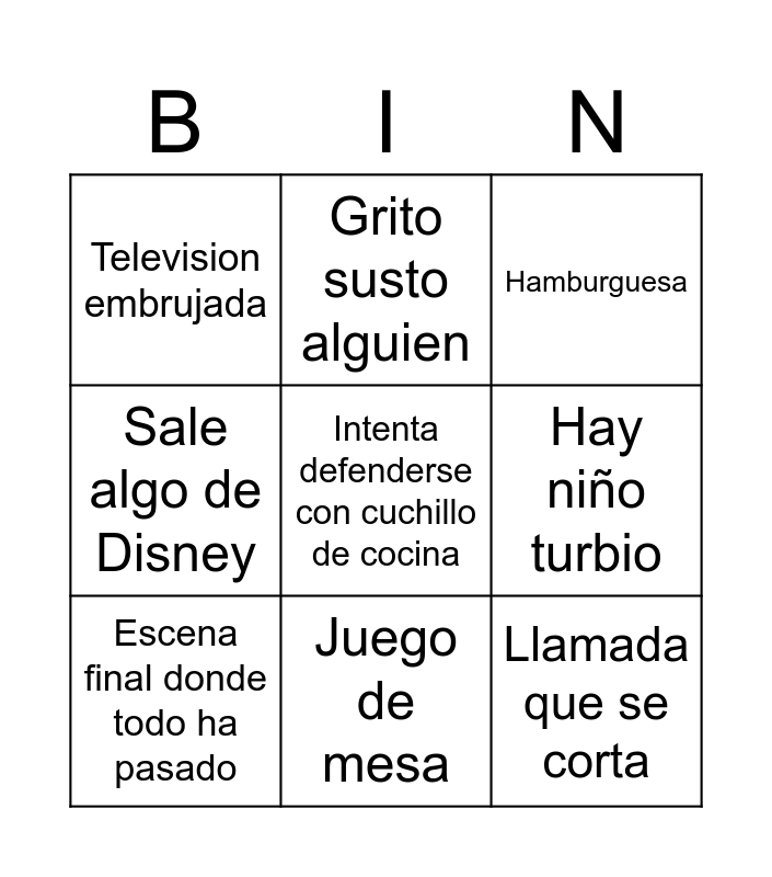 This bingo card has a free space and 8 words: Hay niño turbio, Hamburguesa, Grito susto alguien, Escena final donde todo ha pasado, Television embrujada, Llamada que se corta, Sale algo de Disney and Juego de mesa.