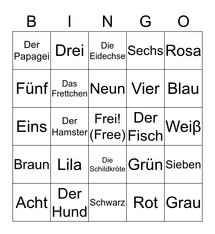 This bingo card has a free space and 30 words: Der Hund, Die Katze, Der Hamster, Das Kaninchen, Der Papagei, Die Eidechse, Das Frettchen, Die Schildkröte, Der Fisch, Schwarz, Weiβ, Grau, Rot, Gelb, Blau, Orange, Grün, Braun, Lila, Rosa, Eins, Zwei, Drei, Vier, Fünf, Sechs, Sieben, Acht, Neun and Zehn.
