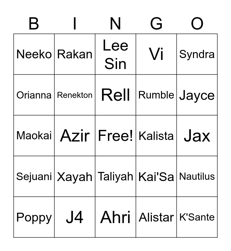 This bingo card has a free space and 24 words: Xayah, J4, Rell, Poppy, Syndra, Neeko, Orianna, Rakan, Kalista, Taliyah, Rumble, Maokai, Kai'Sa, Nautilus, Renekton, Alistar, Jax, Lee Sin, Jayce, Azir, K'Sante, Sejuani, Vi and Ahri.
