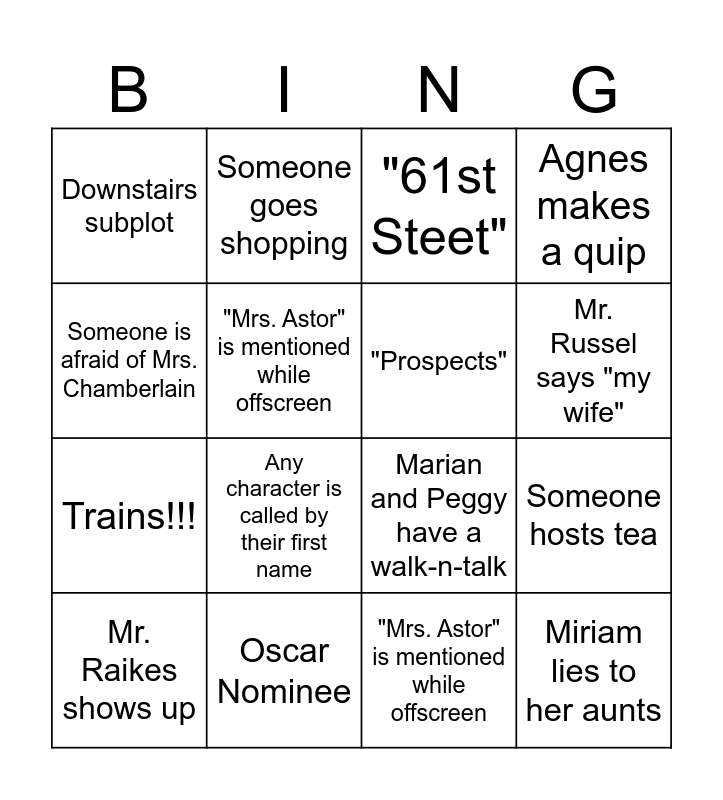 This bingo card has 17 words: "Mrs. Astor" is mentioned while offscreen, Mr. Raikes shows up, "61st Steet", Downstairs subplot, Any character is called by their first name, Agnes makes a quip, Someone hosts tea, "Prospects", Mr. Russel says "my wife", "Mrs. Astor" is mentioned while offscreen, Oscar Nominee, Marian and Peggy have a walk-n-talk, Someone is afraid of Mrs. Chamberlain, Someone goes shopping, Trains!!!, Tiny glasses and Miriam lies to her aunts.