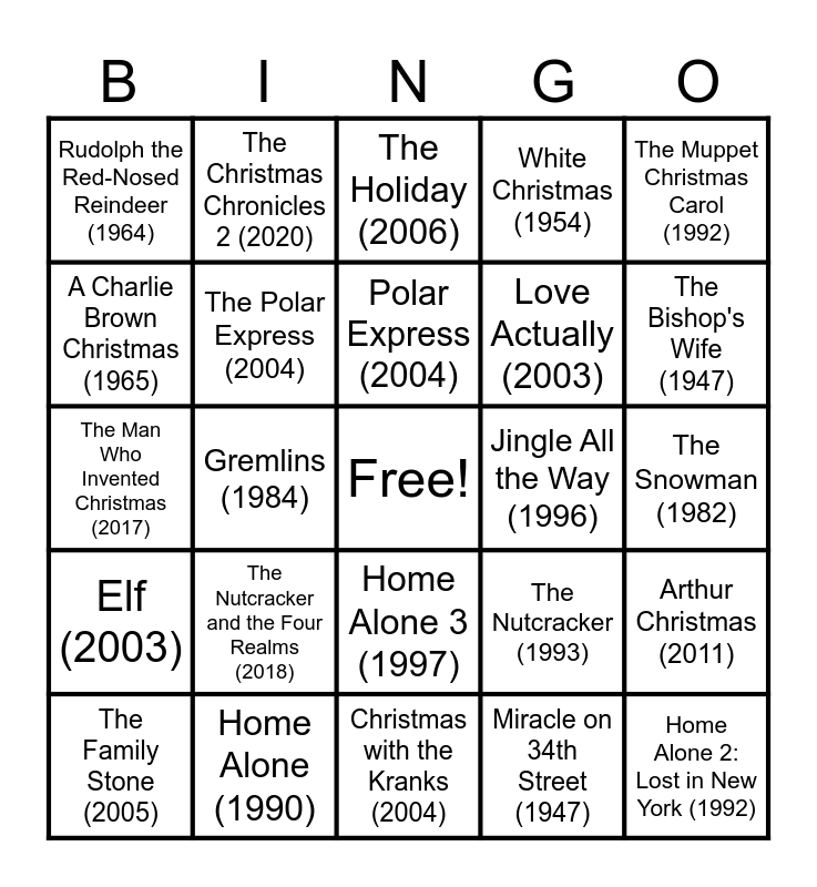 This bingo card has a free space and 59 words: It's a Wonderful Life (1946), Home Alone (1990), A Christmas Story (1983), Elf (2003), Miracle on 34th Street (1947), National Lampoon's Christmas Vacation (1989), The Polar Express (2004), The Grinch (2000), Love Actually (2003), Die Hard (1988), White Christmas (1954), The Santa Clause (1994), A Charlie Brown Christmas (1965), Scrooged (1988), The Nightmare Before Christmas (1993), Rudolph the Red-Nosed Reindeer (1964), Home Alone 2: Lost in New York (1992), The Muppet Christmas Carol (1992), A Christmas Carol (1951), Polar Express (2004), Jingle All the Way (1996), The Holiday (2006), The Family Stone (2005), Arthur Christmas (2011), The Preacher's Wife (1996), Four Christmases (2008), The Best Man Holiday (2013), Frosty the Snowman (1969), The Bishop's Wife (1947), A Christmas Carol (1984), Holiday Inn (1942), Fred Claus (2007), The Christmas Chronicles (2018), Black Christmas (1974), The Christmas Chronicles 2 (2020), The Christmas Card (2006), Krampus (2015), Gremlins (1984), A Very Harold & Kumar 3D Christmas (2011), The Man Who Invented Christmas (2017), Mixed Nuts (1994), The Nutcracker and the Four Realms (2018), The Snowman (1982), Prancer (1989), The Star (2017), Scrooge (1970), The Santa Clause 2 (2002), The Christmas Candle (2013), Home Alone 3 (1997), Christmas with the Kranks (2004), The Santa Clause 3: The Escape Clause (2006), A Christmas Carol (1999), The Christmas List (1997), The Shop Around the Corner (1940), A Christmas Tale (2008), The Nutcracker (1993), Noelle (2019), The Christmas Chronicles: Part 2 (2020) and Jack Frost (1998).