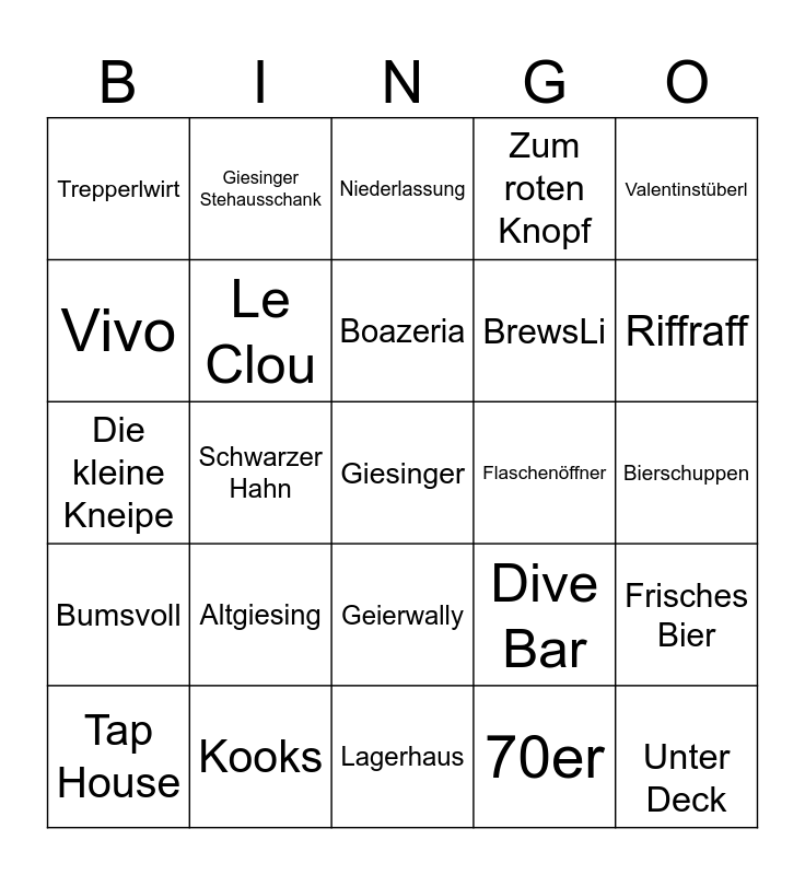 This bingo card has a free space and 24 words: Altgiesing, Kooks, Boazeria, Tap House, Valentinstüberl, Trepperlwirt, Vivo, Giesinger Stehausschank, Flaschenöffner, Geierwally, BrewsLi, Die kleine Kneipe, Dive Bar, Frisches Bier, Le Clou, 70er, Bierschuppen, Niederlassung, Riffraff, Schwarzer Hahn, Unter Deck, Bumsvoll, Zum roten Knopf and Lagerhaus.