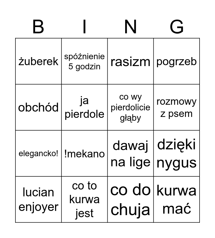 This bingo card has 16 words: co to kurwa jest, dzięki nygus, rasizm, żuberek, elegancko!, spóźnienie 5 godzin, dawaj na lige, co do chuja, obchód, ja pierdole, lucian enjoyer, pogrzeb, !mekano, rozmowy z psem, co wy pierdolicie głąby and kurwa mać.