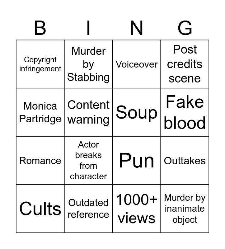 This bingo card has 36 words: Trent building, Violence involving food, Reference to filthy vegan, Soup, Murder by stranglation, Murder by inanimate object, Fake blood, Phone call, Monica Partridge, Murder by bombing, Outtakes, Post credits scene, Cake, Outdated reference, Actor breaks from character, Copyright infringement, Hallwood Library, Any Superhero, Cults, Voiceover, 1000+ views, Apearance of any fruit, Mic/ camera/ set assistant in shot, Violation of SU guidelines, ICE TV News coverage, Murder by Stabbing, Pun, The president, Romance, Content warning, Parody of anything, Cannibalism, Milk, Any clown, Jumpscare and Murder by Zapper/ Lazer gun.