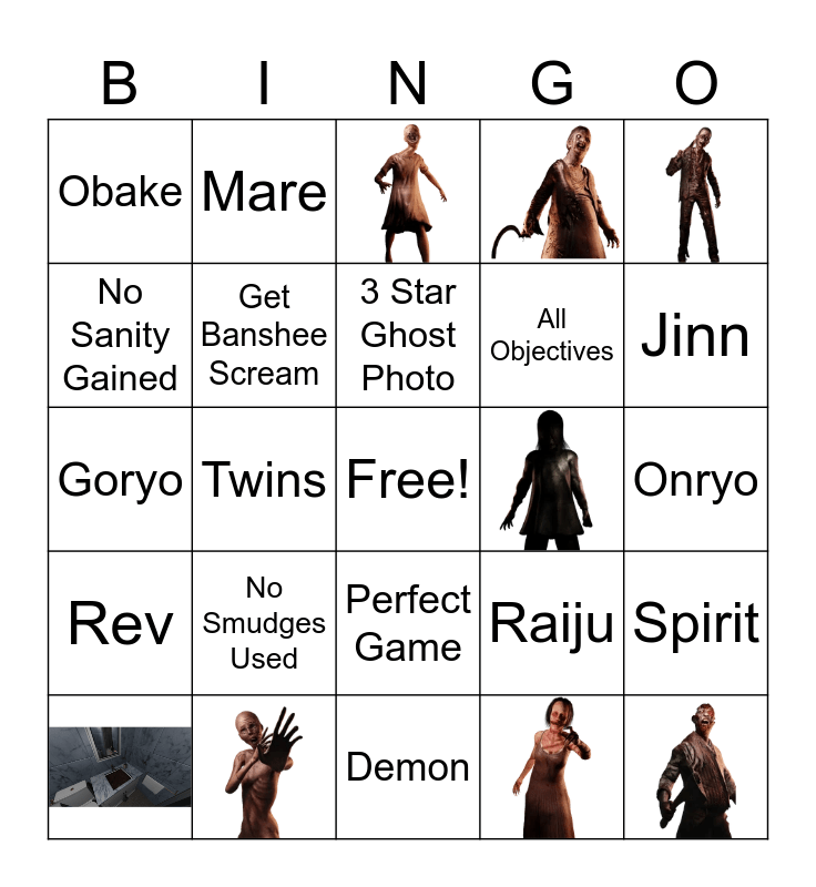 This bingo card has 12 images, a free space and 32 words: Perfect Game, No Smudges Used, Banshee, Demon, Deogen, Goryo, Hantu, Jinn, Mare, Moroi, Myling, Obake, Oni, Onryo, Phantom, Polty, Raiju, Rev, Shade, Spirit, Thaye, Mimic, Twins, Wraith, Yokai, Yurei, 3 Star Ghost Photo, No Sanity Gained, All Objectives, Host Gets Got, Get Banshee Scream and Doll/Mannequin Teleport.