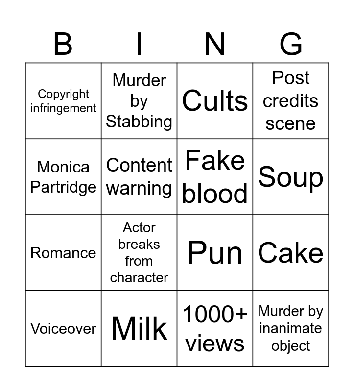 This bingo card has 36 words: Trent building, Violence involving food, Reference to filthy vegan, Fake blood, Murder by stranglation, Murder by inanimate object, Soup, Phone call, Monica Partridge, Murder by bombing, Cake, Post credits scene, Outtakes, Milk, Actor breaks from character, Copyright infringement, Hallwood Library, Any Superhero, Voiceover, Cults, 1000+ views, Apearance of any fruit, Mic/ camera/ set assistant in shot, Violation of SU guidelines, ICE TV News coverage, Murder by Stabbing, Pun, The president, Romance, Content warning, Parody of anything, Cannibalism, Outdated reference, Any clown, Jumpscare and Murder by Zapper/ Lazer gun.
