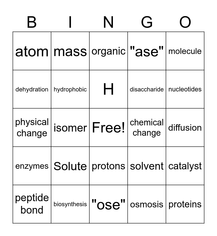 This bingo card has a free space and 24 words: Solute, biosynthesis, H, peptide bond, molecule, atom, dehydration, mass, chemical change, protons, disaccharide, physical change, solvent, catalyst, hydrophobic, osmosis, diffusion, organic, nucleotides, isomer, proteins, enzymes, "ase" and "ose".