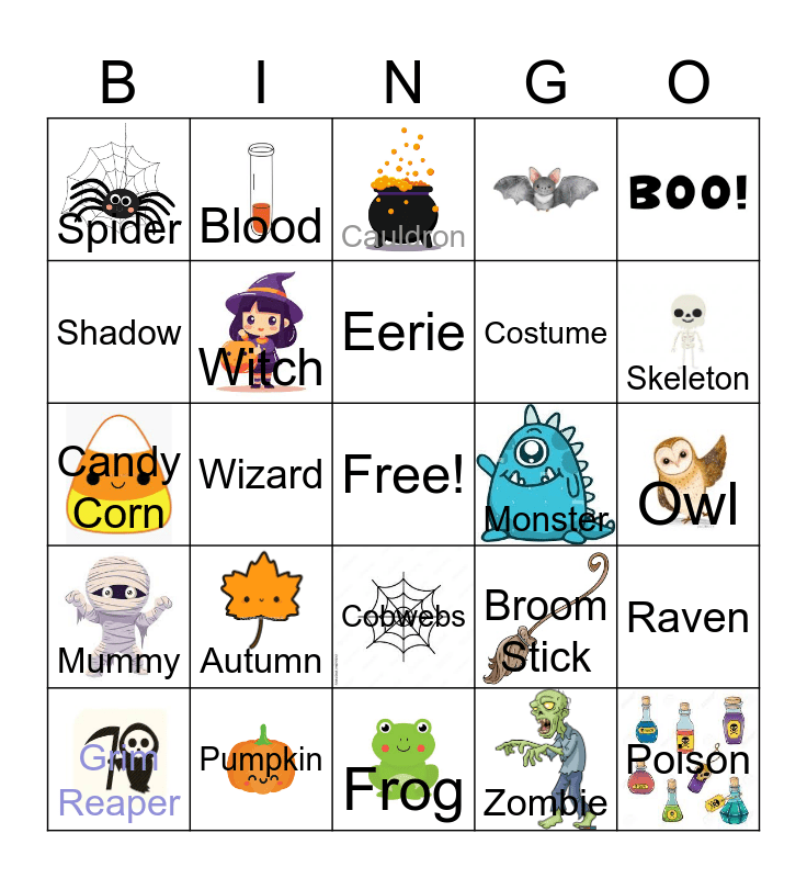 This bingo card has 26 images, a free space and 31 words: Ghost, Zombie, Kitkat, Vampire, Mummy, Witch, Grim Reaper, Blood, Goblin, Eerie, Cauldron, Haunted, Monster, Skeleton, Pumpkin, Candy Corn, Autumn, Broom Stick, Cobwebs, Eyeballs, Spider, Owl, Frog, Poison, Full Moon, Costume, Shadow, Scarecrow, Wizard, Raven and Hersey Bar.