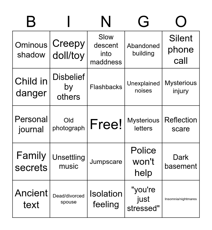 This bingo card has a free space and 24 words: Unsettling music, Dead/divorced spouse, Flashbacks, Ancient text, Silent phone call, Ominous shadow, Child in danger, Creepy doll/toy, Mysterious letters, Jumpscare, Unexplained noises, Personal journal, Police won't help, Dark basement, Disbelief by others, "you're just stressed", Reflection scare, Slow descent into maddness, Mysterious injury, Old photograph, Insomnia/nightmares, Family secrets, Abandoned building and Isolation feeling.