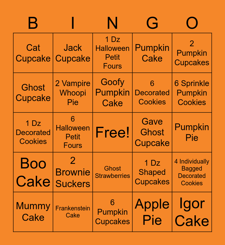 This bingo card has a free space and 24 words: 2 Brownie Suckers, Frankenstein Cake, Goofy Pumpkin Cake, Mummy Cake, 2 Pumpkin Cupcakes, Cat Cupcake, Ghost Cupcake, Jack Cupcake, Gave Ghost Cupcake, Ghost Strawberries, 6 Decorated Cookies, 1 Dz Decorated Cookies, 1 Dz Shaped Cupcakes, 4 Individually Bagged Decorated Cookies, 2 Vampire Whoopi Pie, Apple Pie, Pumpkin Pie, 1 Dz Halloween Petit Fours, 6 Sprinkle Pumpkin Cookies, 6 Halloween Petit Fours, Igor Cake, Boo Cake, Pumpkin Cake and 6 Pumpkin Cupcakes.