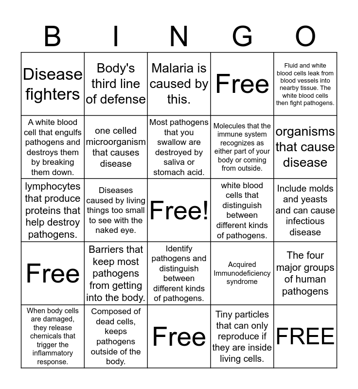 This bingo card has a free space and 24 words: Barriers that keep most pathogens from getting into the body., Composed of dead cells, keeps pathogens outside of the body., Most pathogens that you swallow are destroyed by saliva or stomach acid., When body cells are damaged, they release chemicals that trigger the inflammatory response., Fluid and white blood cells leak from blood vessels into nearby tissue. The white blood cells then fight pathogens., Disease fighters, A white blood cell that engulfs pathogens and destroys them by breaking them down., Body's third line of defense, white blood cells that distinguish between different kinds of pathogens., Identify pathogens and distinguish between different kinds of pathogens., Molecules that the immune system recognizes as either part of your body or coming from outside., lymphocytes that produce proteins that help destroy pathogens., Acquired Immunodeficiency syndrome, The four major groups of human pathogens, one celled microorganism that causes disease, Tiny particles that can only reproduce if they are inside living cells., Include molds and yeasts and can cause infectious disease, Malaria is caused by this., organisms that cause disease, Diseases caused by living things too small to see with the naked eye., FREE, Free, Free and Free.