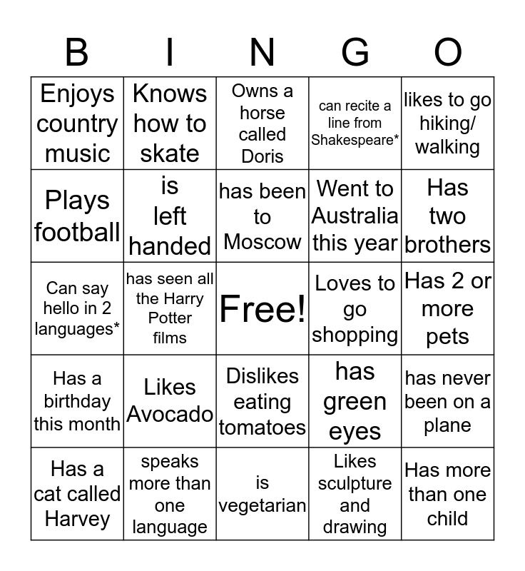 This bingo card has a free space and 24 words: Likes Avocado, speaks more than one language, has been to Moscow, Has a cat called Harvey, likes to go hiking/ walking, Enjoys country music, Plays football, Knows how to skate, Loves to go shopping, Dislikes eating tomatoes, Went to Australia this year, Can say hello in 2 languages*, has green eyes, has never been on a plane, is left handed, Likes sculpture and drawing, Has 2 or more pets, Owns a horse called Doris, Has two brothers, has seen all the Harry Potter films, Has more than one child, Has a birthday this month, can recite a line from Shakespeare* and is vegetarian.