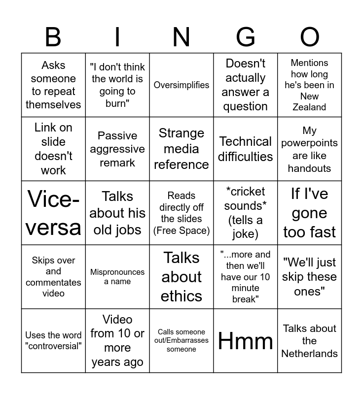 This bingo card has a free space and 46 words: "I'll be going through this fast", Talks about the Netherlands, Mentions Bicycling, Calls someone out/Embarrasses someone, Mispronounces a name, Strange Tangent, "I don't think the world is going to burn", Asks the Zoom call if they can hear him, Link on slide doesn't work, Pauses a video to say nothing, Passive aggressive remark, Doesn't actually answer a question, "We'll just skip these ones", "...more and then we'll have our 10 minute break", Mentions his family, "I have even stood in when I've had to", Strange media reference, *cricket sounds* (tells a joke), Weird flex, Mentions how long he's been in New Zealand, Talks about his old jobs, Hmm, Asks someone to repeat themselves, Technical difficulties, Uncomfortable silence, My powerpoints are like handouts, Uses the word "controversial", You can read these yourselves, Talks about ethics, Skips over and commentates video, Typo on slides, Talks about camping, Super loud video, Brings up the book, Imagine doing xyz, Video from 10 or more years ago, If I've gone too fast, "In a nutshell", talks about the presheet, mentions debating, says the same word 5 times in a minute, Oversimplifies, Vice-versa, Feel free to email me, Mentions the US and Strange emphasis.