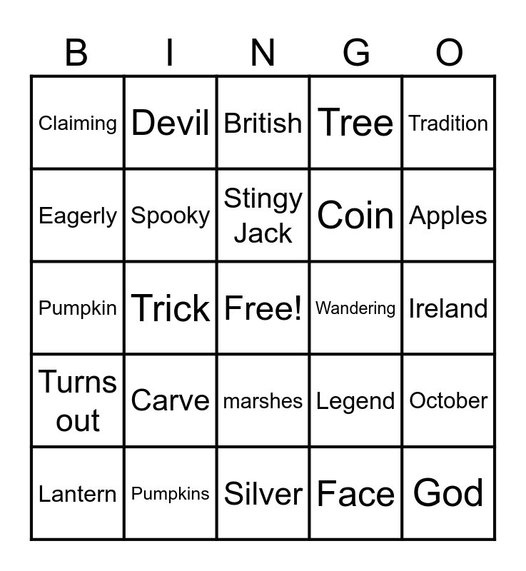 This bingo card has a free space and 24 words: Carve, Pumpkins, Stingy Jack, Lantern, Tradition, Claiming, Eagerly, Devil, Wandering, marshes, Coin, Pumpkin, Legend, October, Spooky, Face, Ireland, British, Apples, Trick, God, Turns out, Tree and Silver.