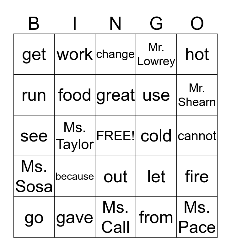 This bingo card has a free space and 24 words: because, gave, great, go, hot, get, run, work, cold, out, use, see, let, fire, food, from, cannot, change, Mr. Shearn, Ms. Taylor, Ms. Pace, Ms. Sosa, Mr. Lowrey and Ms. Call.