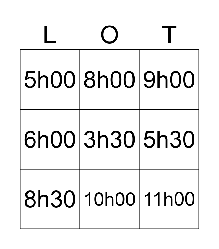 This bingo card has 18 words: 2h00, 4h00, 9h00, 5h00, 3h00, 6h00, 7h00, 8h00, 10h00, 11h00, 12h00, 3h30, 4h30, 5h30, 8h30, 1h00, 2h00 and 4h30.