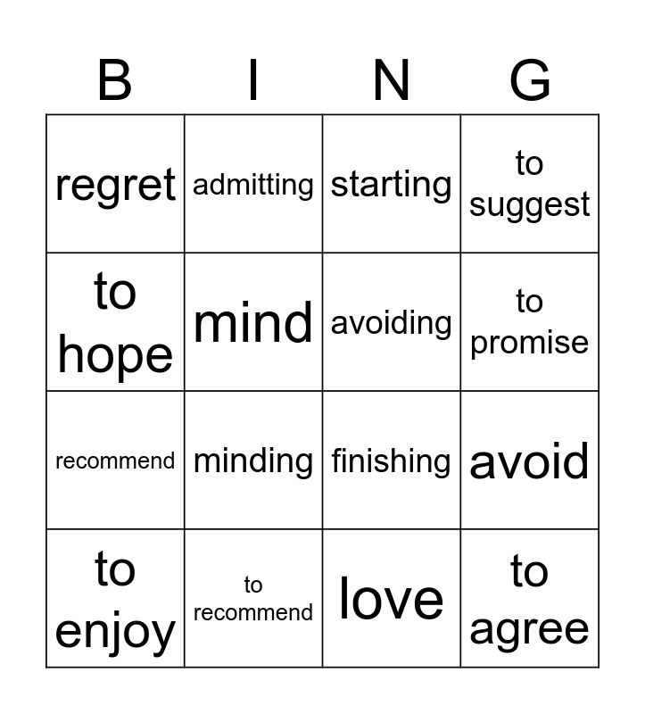 This bingo card has 34 words: to finish, hating, to offer, suggesting, to agree, avoiding, to hope, liking, admitting, to plan, to promise, starting, to decide, enjoying, to recommend, minding, continuing, finishing, to like, promise, to start, advise, regret, love, advising, to enjoy, to suggest, beginning, recommend, mind, hate, avoid, Tafur's free box and Pipempanadas sponsors this game.