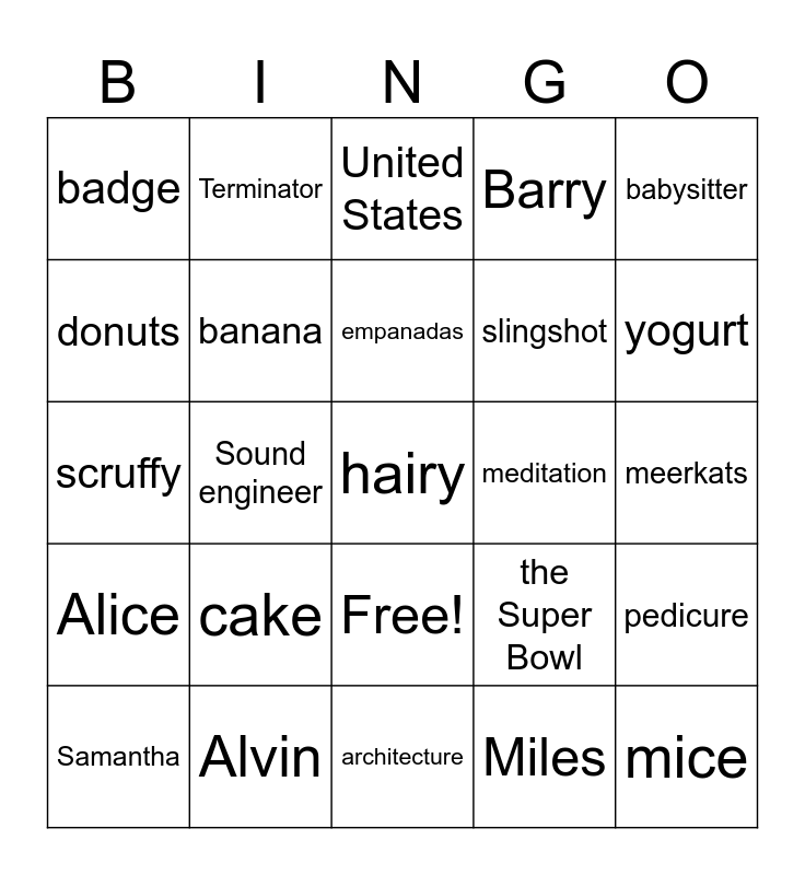 This bingo card has 26 words: Free!, Miles, empanadas, Alvin, babysitter, badge, donuts, Terminator, meerkats, the Super Bowl, slingshot, scruffy, pedicure, Samantha, Sound engineer, Breath mint, Barry, Alice, United States, hairy, yogurt, architecture, meditation, cake, banana and mice.