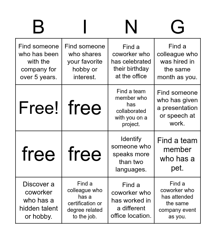 This bingo card has 16 words: Find a colleague who has a certification or degree related to the job., Find a team member who has a pet., Find a coworker who has celebrated their birthday at the office, Find someone who has been with the company for over 5 years., free, Find someone who shares your favorite hobby or interest., Identify someone who speaks more than two languages., Find a coworker who has worked in a different office location., Free!, free, Discover a coworker who has a hidden talent or hobby., Find a colleague who was hired in the same month as you., free, Find someone who has given a presentation or speech at work., Find a team member who has collaborated with you on a project. and Find a coworker who has attended the same company event as you..
