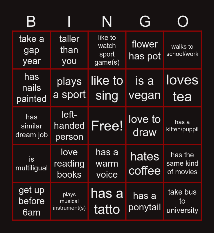 This bingo card has a free space and 25 words: is multiligual, plays musical instrument(s), has a tatto, has a ponytail, walks to school/work, take a gap year, taller than you, like to watch sport game(s), love to draw, has the same kind of movies, has nails painted, plays a sport, has run a marathon, hates coffee, loves tea, get up before 6am, left-handed person, like to sing, is a vegan, has a kitten/puppil, has similar dream job, love reading books, has a warm voice, flower has pot and take bus to university.
