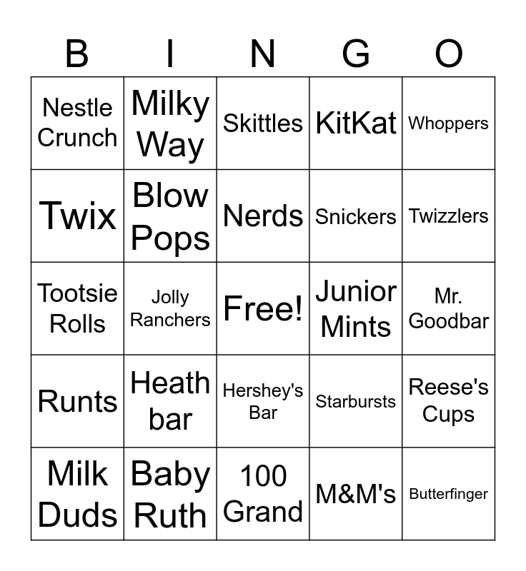This bingo card has a free space and 33 words: Smarties, Airheads, Jolly Ranchers, Sour Patch Kids, Runts, Blow Pops, Whoppers, Milk Duds, Milky Way, Laffy Taffy, Nerds, Skittles, PayDay, Haribo Gummies, Junior Mints, Twizzlers, Baby Ruth, Tootsie Rolls, Heath bar, Starbursts, Hershey's Bar, Reese's Pieces, Nestle Crunch, Mr. Goodbar, 100 Grand, Butterfinger, KitKat, Snickers, Twix, Reese's Cups, 3 Musketeers, M&M's and Candy Corn.