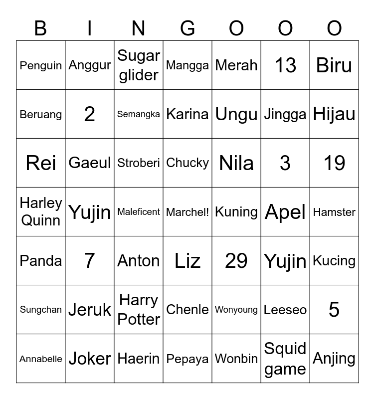 This bingo card has a free space and 48 words: Wonyoung, Jingga, Pepaya, Yujin, Stroberi, Hamster, Anggur, Joker, 13, Liz, Biru, Mangga, 3, Nila, Sungchan, Apel, Beruang, Hijau, Leeseo, Merah, Ungu, Maleficent, Penguin, 2, 5, Semangka, 19, Annabelle, Chucky, Gaeul, Squid game, Kuning, Kucing, Jeruk, Harley Quinn, 29, Yujin, Rei, Anton, Harry Potter, Panda, Anjing, Sugar glider, Haerin, Karina, Chenle, 7 and Wonbin.