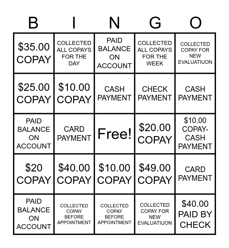 This bingo card has a free space and 24 words: $40.00 COPAY, COLLECTED COPAY BEFORE APPOINTMENT, CASH PAYMENT, PAID BALANCE ON ACCOUNT, COLLECTED COPAY FOR NEW EVALUATIUON, $35.00 COPAY, $25.00 COPAY, COLLECTED ALL COPAYS FOR THE DAY, $20.00 COPAY, $10.00 COPAY, CHECK PAYMENT, PAID BALANCE ON ACCOUNT, $49.00 COPAY, CARD PAYMENT, $10.00 COPAY, COLLECTED COPAY FOR NEW EVALUATIUON, $10.00 COPAY-CASH PAYMENT, PAID BALANCE ON ACCOUNT, CASH PAYMENT, CARD PAYMENT, $40.00 PAID BY CHECK, $20 COPAY, COLLECTED ALL COPAYS FOR THE WEEK and COLLECTED COPAY BEFORE APPOINTMENT.