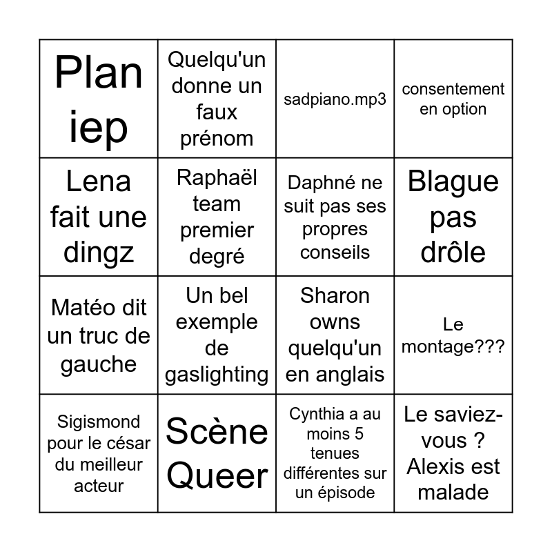 This bingo card has 16 words: Scène Queer, Le montage???, sadpiano.mp3, Plan iep, Matéo dit un truc de gauche, Quelqu'un donne un faux prénom, Sharon owns quelqu'un en anglais, Cynthia a au moins 5 tenues différentes sur un épisode, Lena fait une dingz, Raphaël team premier degré, Sigismond pour le césar du meilleur acteur, consentement en option, Un bel exemple de gaslighting, Blague pas drôle, Daphné ne suit pas ses propres conseils and Le saviez-vous ?Alexis est malade.