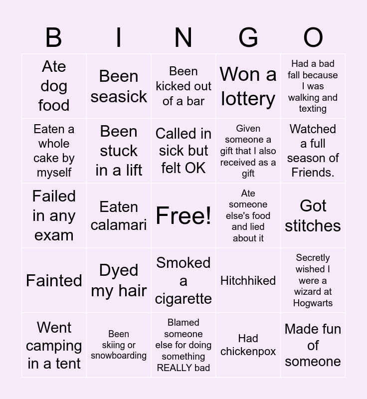 This bingo card has a free space and 24 words: Dyed my hair, Been skiing or snowboarding, Called in sick but felt OK, Went camping in a tent, Had a bad fall because I was walking and texting, Ate dog food, Eaten a whole cake by myself, Been seasick, Ate someone else's food and lied about it, Smoked a cigarette, Given someone a gift that I also received as a gift, Failed in any exam, Hitchhiked, Secretly wished I were a wizard at Hogwarts, Been stuck in a lift, Had chickenpox, Got stitches, Been kicked out of a bar, Watched a full season of Friends., Eaten calamari, Made fun of someone, Fainted, Won a lottery and Blamed someone else for doing something REALLY bad.