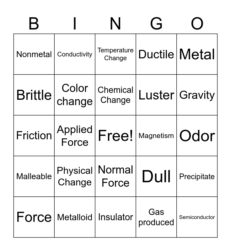 This bingo card has a free space and 24 words: Physical Change, Metalloid, Chemical Change, Force, Metal, Nonmetal, Brittle, Conductivity, Magnetism, Normal Force, Luster, Friction, Dull, Precipitate, Color change, Gas produced, Odor, Temperature Change, Gravity, Applied Force, Semiconductor, Malleable, Ductile and Insulator.