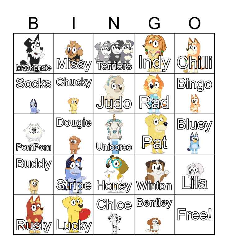 This bingo card has 30 images and 31 words: Chloe, Muffin, Dougie, Snickers, Mackenzie, Terriers, Chucky, Winton, Pat, Bentley, Bluey, Unicorse, Free!, Bandit, Bingo, Jack, Lila, Stripe, Buddy, Honey, Chilli, Floppy, Rusty, Missy, Rad, Socks, Indy, PomPom, Lucky, Judo and Coco.