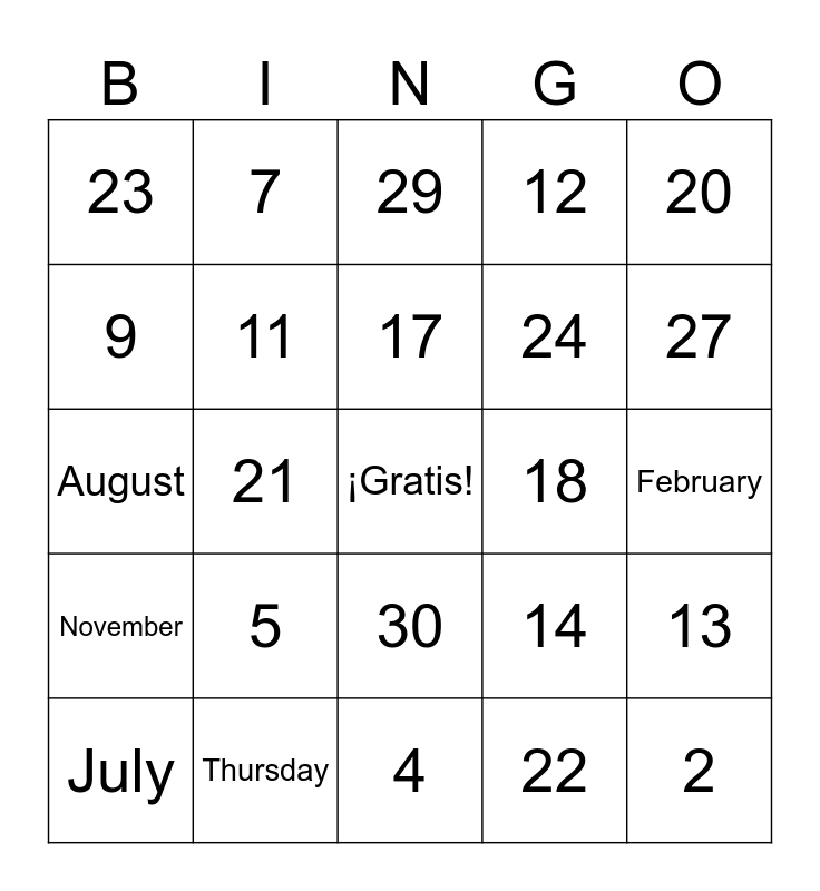 This bingo card has a free space and 50 words: 1, 2, 3, 4, 5, 6, 7, 8, 9, 10, 11, 12, 13, 14, 15, 16, 17, 18, 19, 20, 21, 22, 23, 24, 25, 26, 27, 28, 29, 30, 31, Monday, Tuesday, Wednesday, Thursday, Friday, Saturday, Sunday, January, February, March, April, May, June, July, August, September, October, November and December.