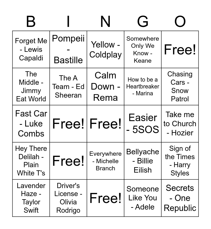 This bingo card has a free space and 24 words: Free!, Driver's License - Olivia Rodrigo, Calm Down - Rema, Lavender Haze - Taylor Swift, Free!, Forget Me - Lewis Capaldi, The Middle - Jimmy Eat World, Pompeii - Bastille, Easier - 5SOS, Everywhere - Michelle Branch, How to be a Heartbreaker - Marina, Fast Car - Luke Combs, Bellyache - Billie Eilish, Sign of the Times - Harry Styles, The A Team - Ed Sheeran, Someone Like You - Adele, Take me to Church - Hozier, Yellow - Coldplay, Chasing Cars - Snow Patrol, Free!, Secrets - One Republic, Hey There Delilah - Plain White T's, Somewhere Only We Know - Keane and Free!.