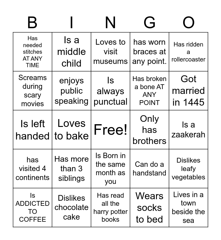 This bingo card has a free space and 24 words: Has more than 3 siblings, Dislikes chocolate cake, Is always punctual, Is ADDICTED TO COFFEE, Has ridden a rollercoaster, Has needed stitches AT ANY TIME, Screams during scary movies, Is a middle child, Only has brothers, Is Born in the same month as you, Has broken a bone AT ANY POINT, Is left handed, Can do a handstand, Dislikes leafy vegetables, enjoys public speaking, Wears socks to bed, Is a zaakerah, Loves to visit museums, Got married in 1445, Loves to bake, Lives in a town beside the sea, has visited 4 continents, has worn braces at any point. and Has read all the harry potter books.