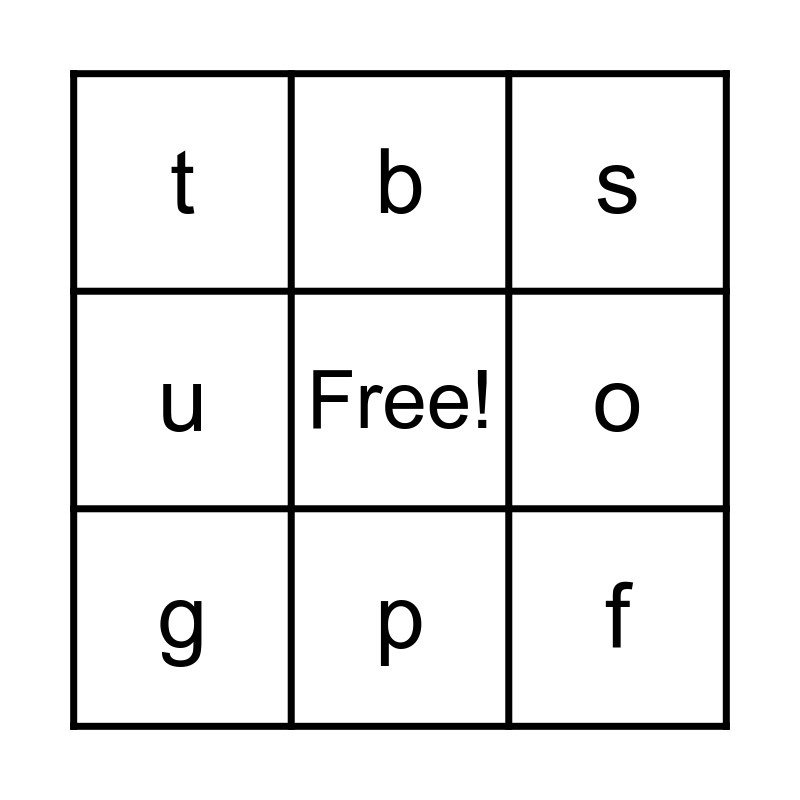 This bingo card has a free space and 15 words: a, m, s, t, p, f, i, n, o, d, c, u, g, b and e.
