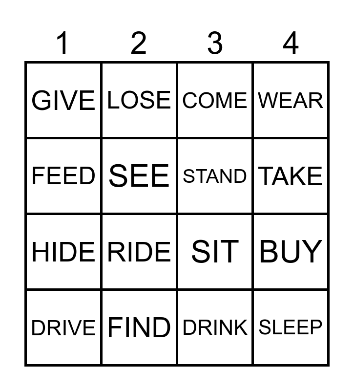 This bingo card has 20 words: BUY, BRING, COME, CHOOSE, DRIVE, FEED, FIND, GIVE, HIDE, LOSE, RIDE, SIT, SEE, SLEEP, STAND, TELL, TAKE, WEAR, DRINK and FIND.