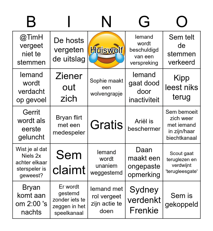 This bingo card has 1 images, a free space and 24 words: Sem claimt, Er wordt gestemd zonder iets te zeggen in het speelkanaal, Sophie maakt een wolvengrapje, Bryan komt aan om 2:00 's nachts, Sem telt de stemmen verkeerd, @TimH vergeet niet te stemmen, Iemand wordt verdacht op gevoel, De hosts vergeten de uitslag, Ariël is beschermer, Iemand wordt unaniem weggestemd, Iemand gaat dood door inactiviteit, Gerrit wordt als eerste geluncht, Daan maakt een ongepaste opmerking, Scout gaat teruglezen en verdwijnt 'terugleesgate', Ziener out zich, Sydney verdenkt Frenkie, Sem bemoeit zich weer met iemand in zijn/haar biechtkanaal, Huiswolf, Kipp leest niks terug, Bryan flirt met een medespeler, Sem is gekoppeld, Wist je al dat Niels 2x achter elkaar sterspeler is geweest?, Iemand wordt beschuldigd van een verspreking and Iemand met rol vergeet zijn actie te doen.