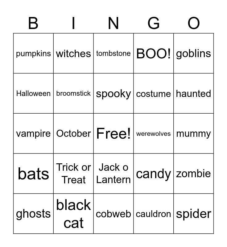 This bingo card has a free space and 24 words: Trick or Treat, black cat, spooky, ghosts, goblins, pumpkins, Halloween, witches, werewolves, Jack o Lantern, costume, vampire, candy, zombie, broomstick, cauldron, mummy, tombstone, haunted, October, spider, bats, BOO! and cobweb.