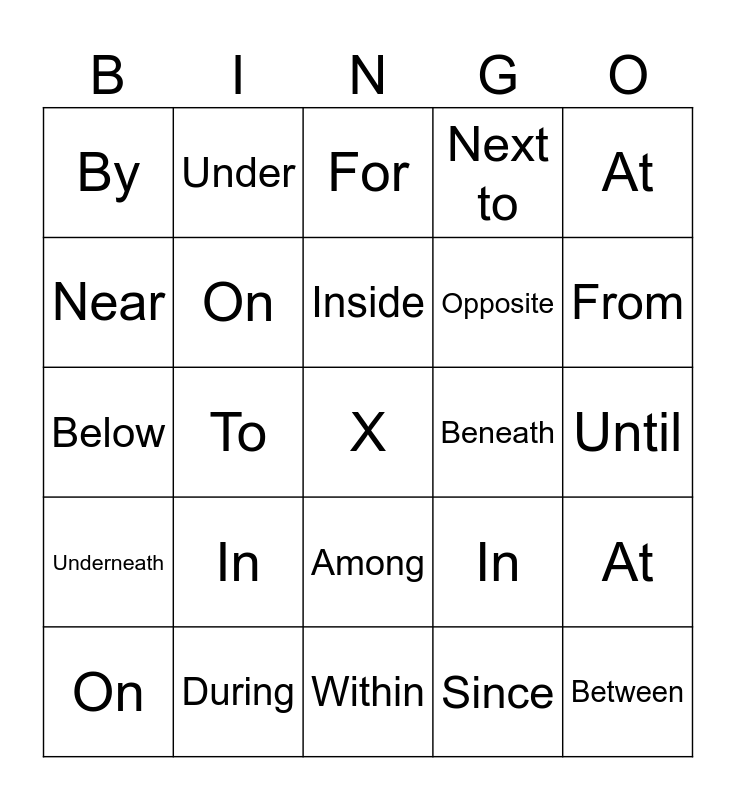 This bingo card has a free space and 24 words: In, During, Inside, On, At, By, Near, Under, Beneath, Among, Opposite, Below, In, At, On, Since, Until, For, From, To, Between, Underneath, Next to and Within.