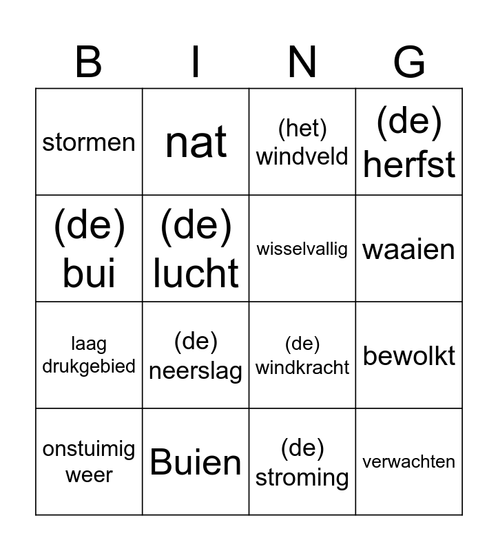 This bingo card has 18 words: (de) neerslag, verwachten, (het) windveld, stormen, (de) windkracht, (de) herfst, onstuimig weer, nat, waaien, laag drukgebied, (de) stroming, (de) bui, bewolkt, (de) lucht, wisselvallig, zacht, Buien and laag drukgebied.