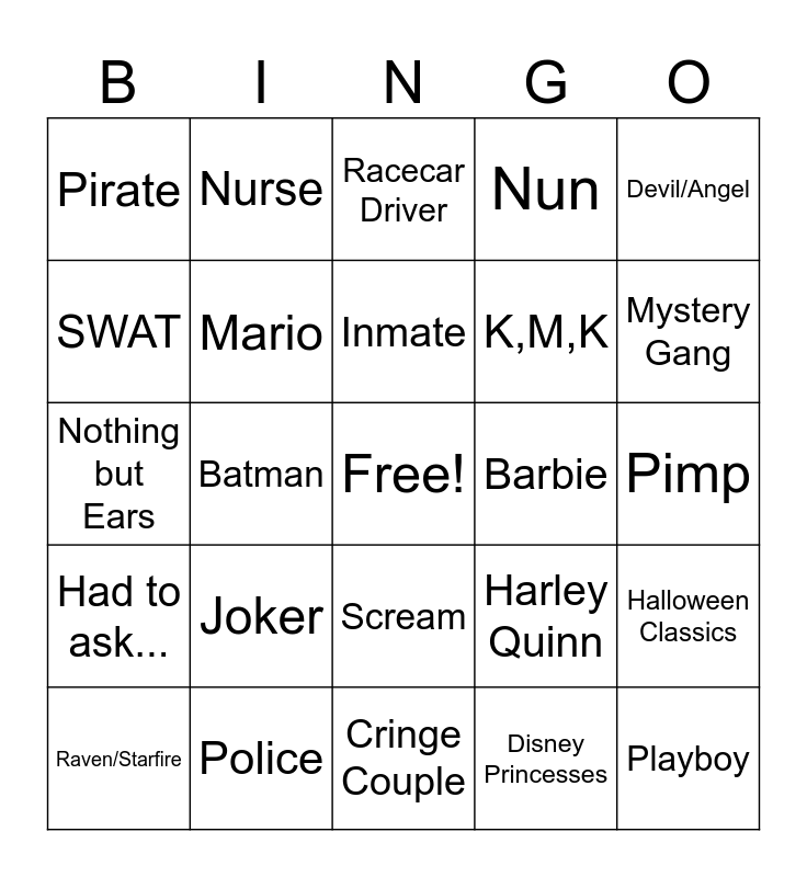 This bingo card has a free space and 24 words: Joker, Police, Inmate, Raven/Starfire, Devil/Angel, Pirate, SWAT, Nurse, Barbie, Scream, K,M,K, Nothing but Ears, Harley Quinn, Halloween Classics, Mario, Disney Princesses, Pimp, Racecar Driver, Mystery Gang, Batman, Playboy, Had to ask..., Nun and Cringe Couple.