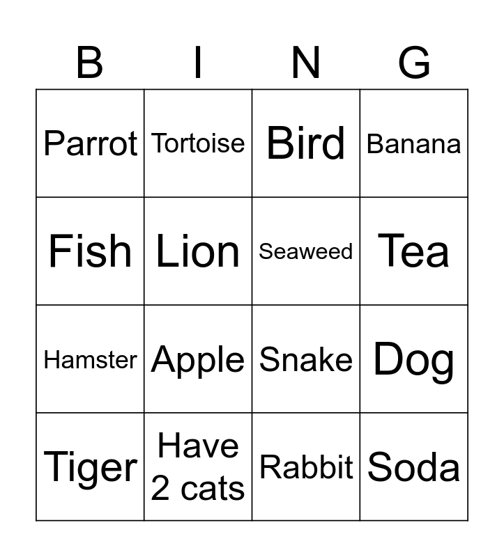 This bingo card has 16 words: Have 2 cats, Dog, Bird, Parrot, Hamster, Tortoise, Snake, Rabbit, Fish, Lion, Tiger, Banana, Apple, Tea, Seaweed and Soda.
