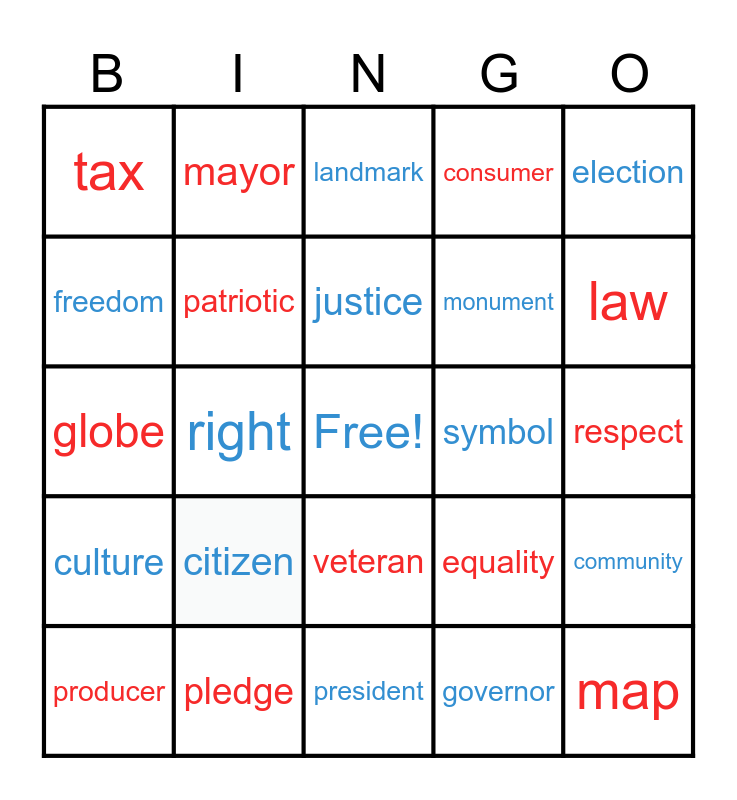 This bingo card has a free space and 24 words: citizen, pledge, justice, producer, election, tax, freedom, mayor, symbol, veteran, monument, globe, equality, community, patriotic, governor, respect, landmark, law, right, map, culture, consumer and president.