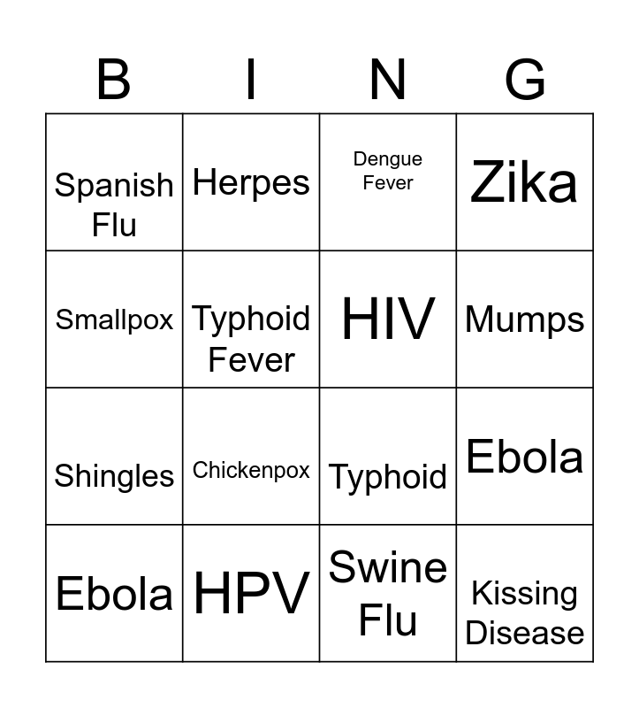 This bingo card has 23 words: Kissing Disease, Measles, Mumps, Rubella, Smallpox, Spanish Flu, Typhoid Fever, Herpes, Ebola, Flu, Chickenpox, Shingles, West Nile Virus, Rabies, HPV, Pox-Syphilis, Dengue Fever, Typhoid, HIV, Ebola, Zika, Swine Flu and Swine Flu.